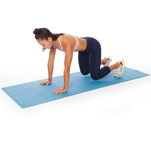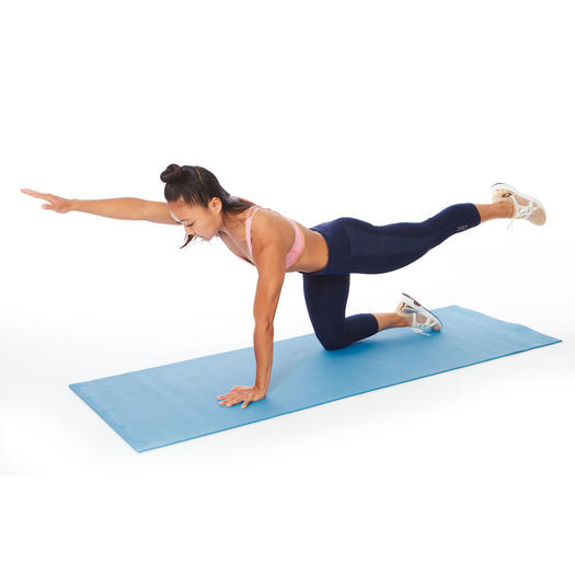 Position yourself on all fours with your palms flat on the floor and shoulder-width apart. Brace your abs and lift the opposing arm and leg to parallel to the floor. Hold the position for 5 to 10 seconds.