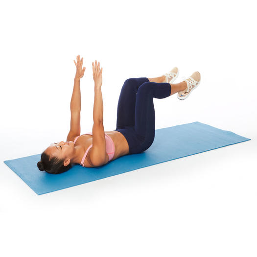 Lie on your back with your legs in the tabletop, your calves parallel to the ground, and your arms stretched up toward the ceiling.