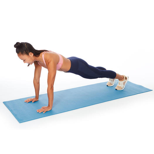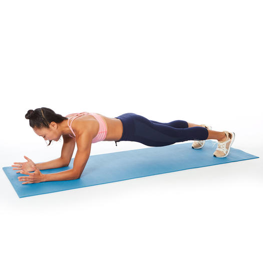 Begin in a high plank stance with your feet hip-width apart and your shoulders over your wrists. Lower yourself onto